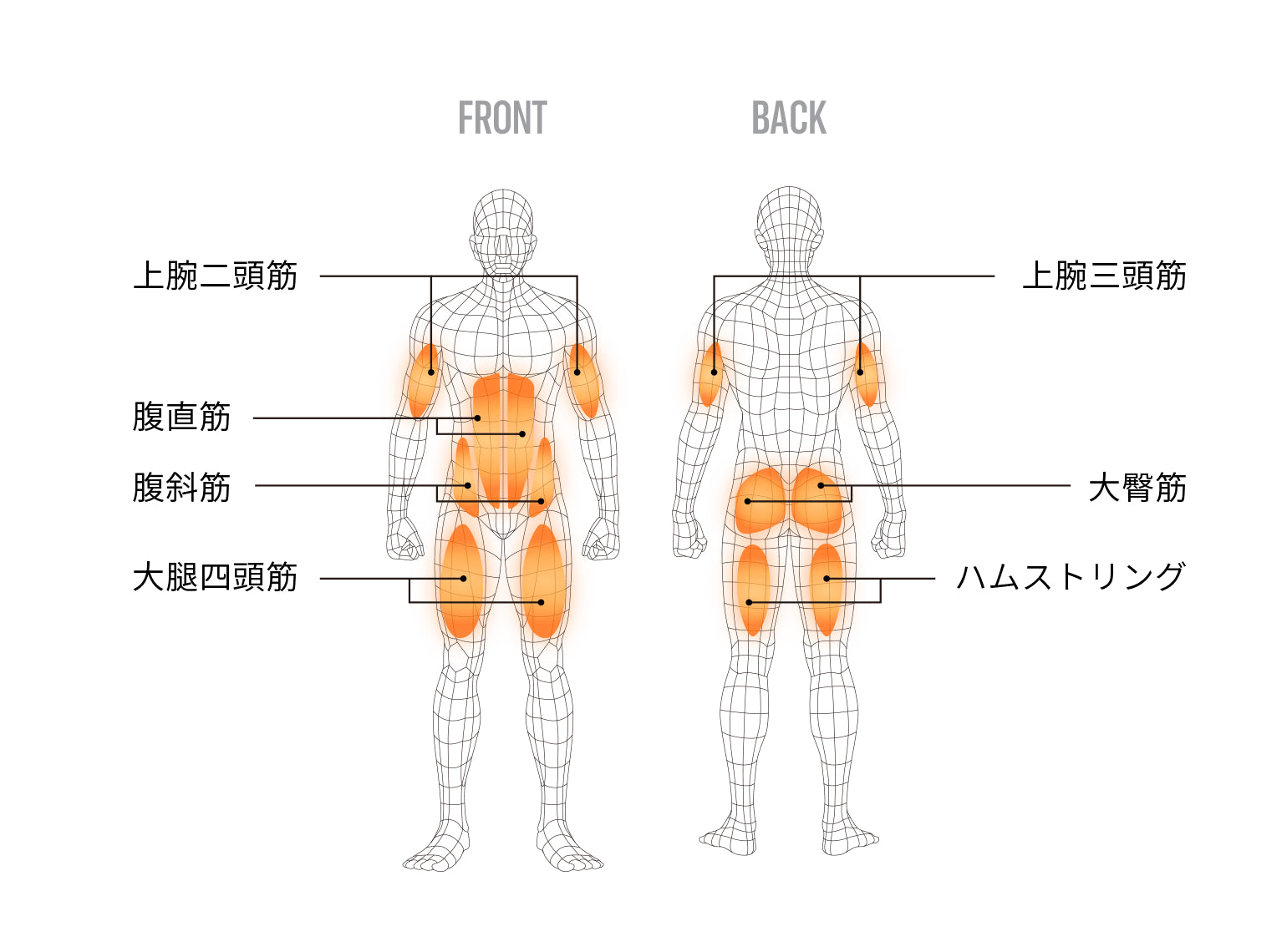 同時に使用することで、最大7部位14箇所の筋肉を同時に鍛えることができます。