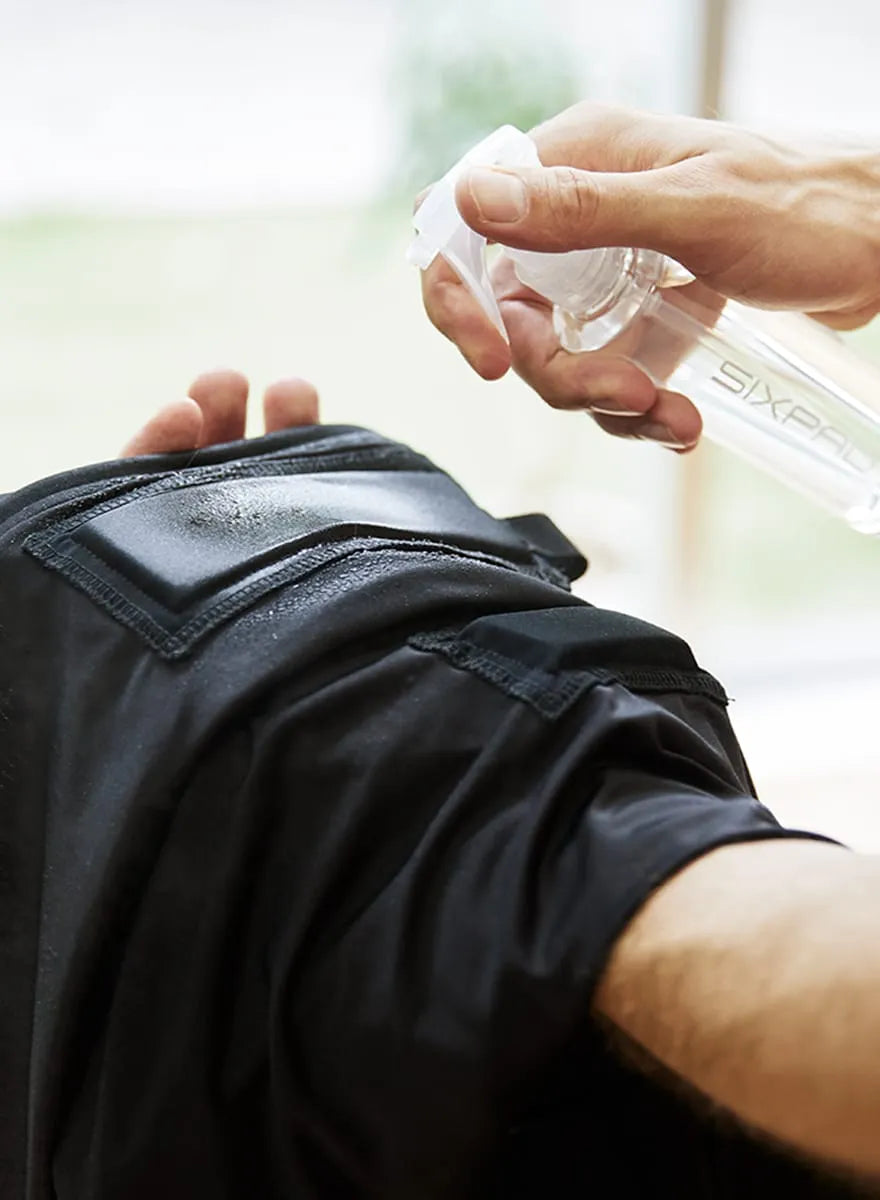 水をスプレーするだけで通電可能な導電性繊維が電極となっており、ジェルシートを必要としません。 薄く軽く、伸縮性に優れ、しっかりと肌に密着します。