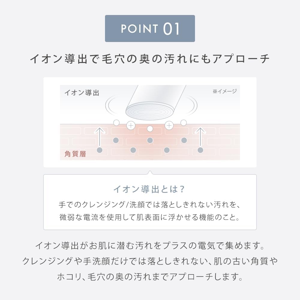 肌に微弱なプラス電流を流し、手洗顔では落としきれない毛穴の奥の汚れやメイク残りをイオンの力で浮かせて引き寄せます。汚れをかき出さず、音波振動で優しく浮かせて落とすため、手でこする洗顔よりも肌に負担をかけにくい設計です。