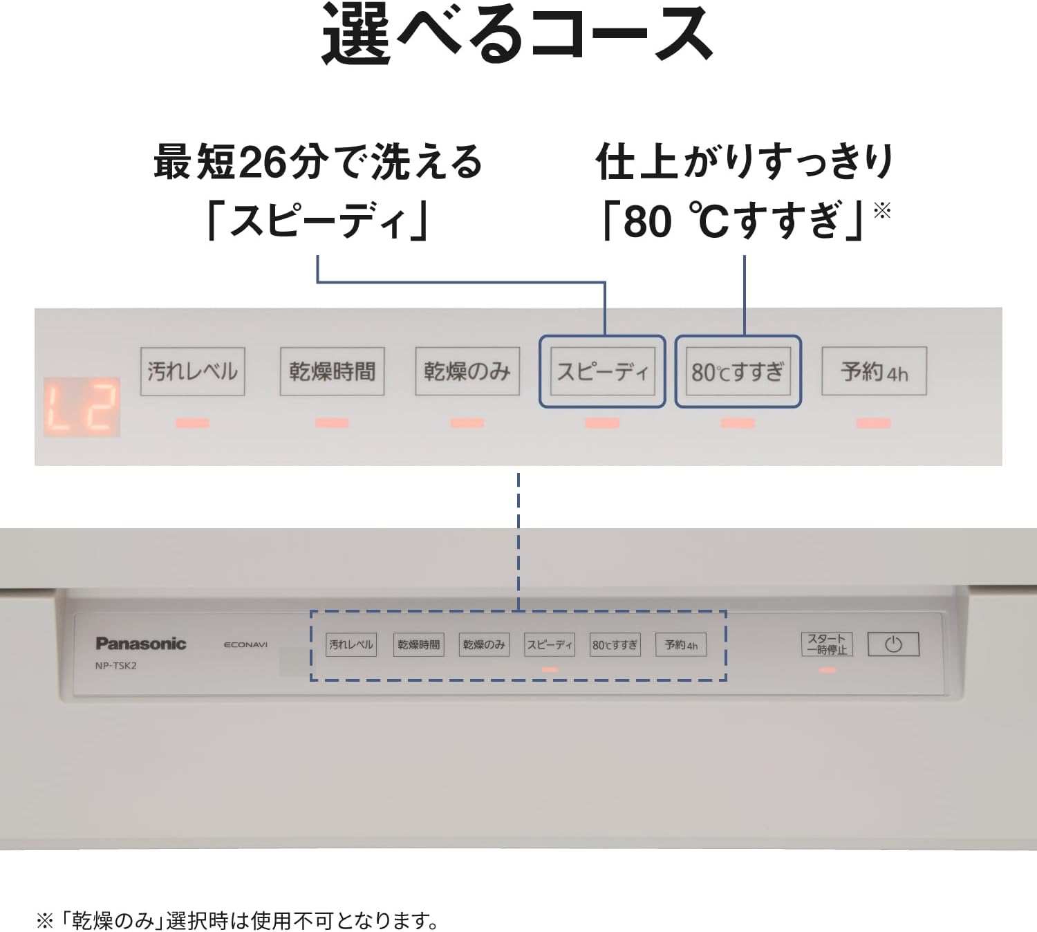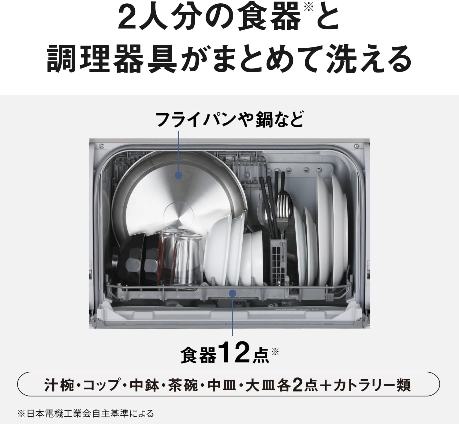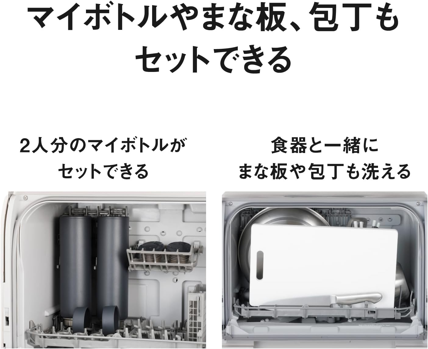 一般的な食洗機よりも薄型で、シンク横の狭いスペースにもスッキリ収まります。ドアが上に持ち上がるように開くため、蛇口に当たりにくく開閉に必要なスペースも最小限で済みます。