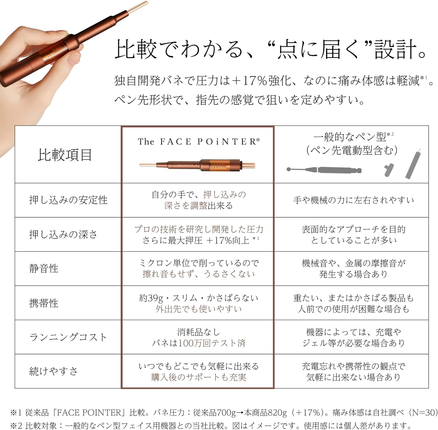 ボールペンのような形状で、いつでもどこでも手軽に使えるデザインです。顔のたるみ、むくみ、エラ張りなどの原因の一つとされる筋肉や筋膜の癒着・コリに着目し、それをほぐすことを目的としています。
