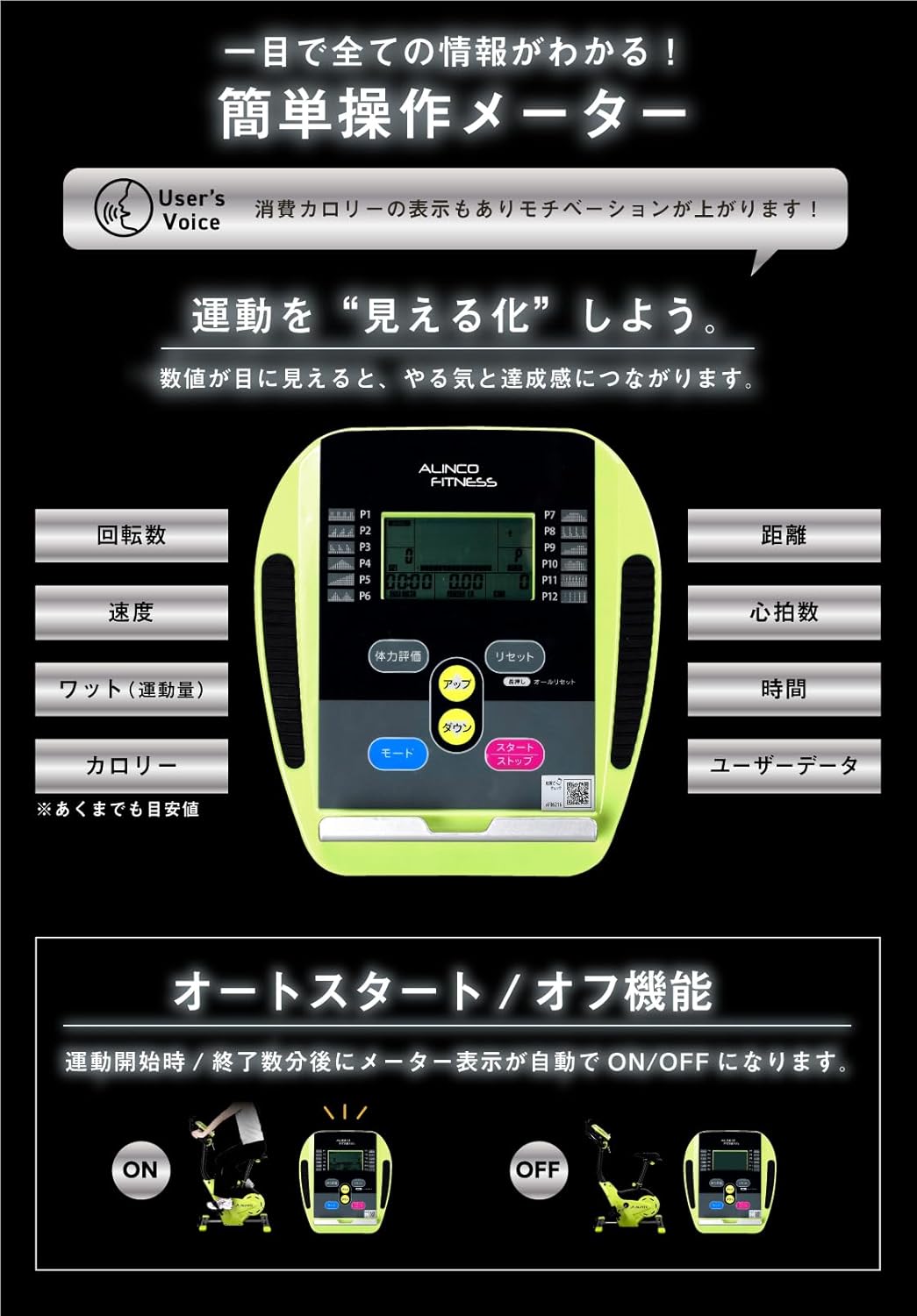 運動を開始すると自動でメーター表示がONに!さらに運動を終了すると数分後に自動で表示をOFF!便利なオート機能で電気代も節約、使いすぎも防ぎます。