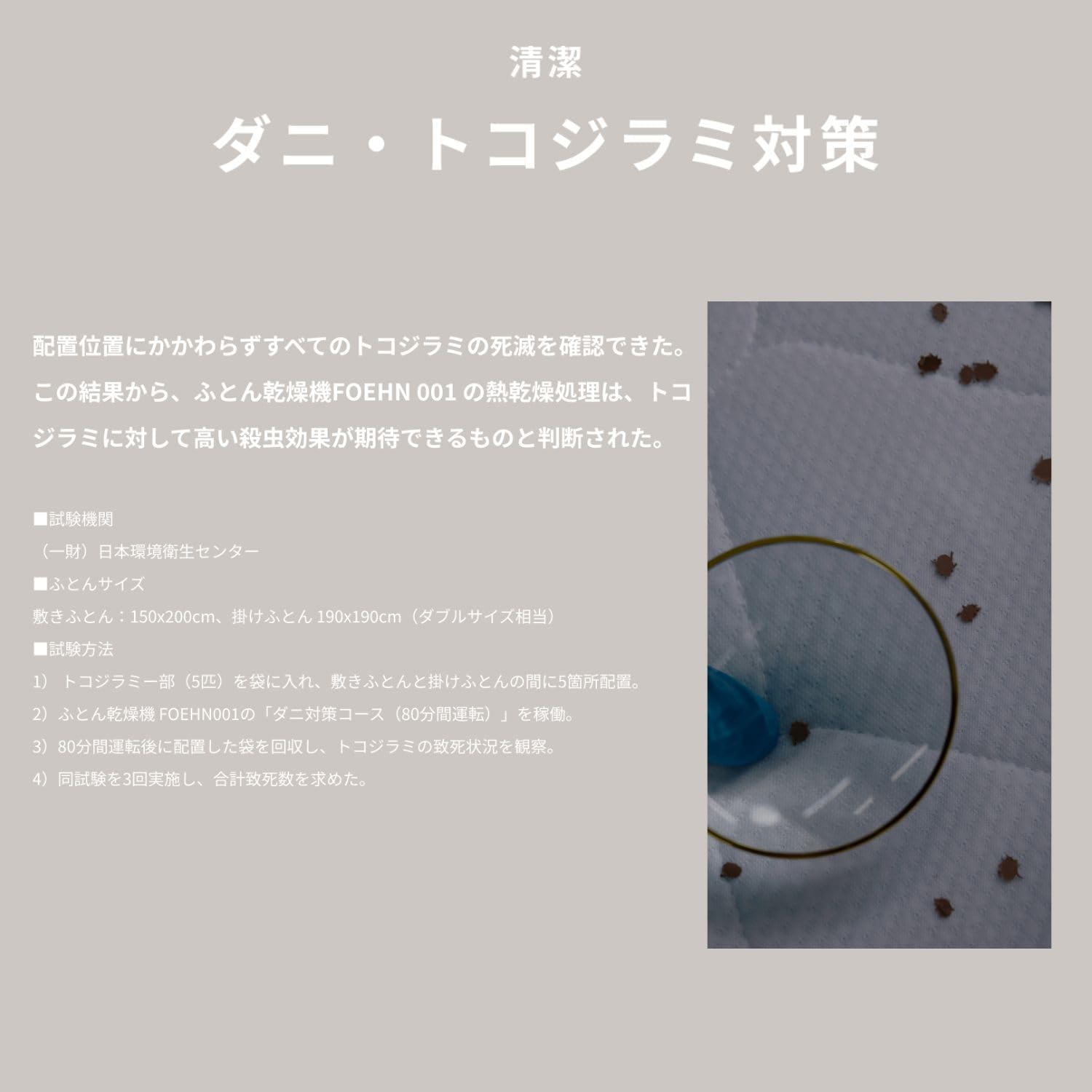 本体サイズが直径約45mm、高さ約260mm、質量が約400gと非常にコンパクトで軽量なスティック形状です。ノズルを布団に差し込むだけで使えるマット・ホースなしのワンタッチ設計で、手軽に布団の温めや乾燥ができます。