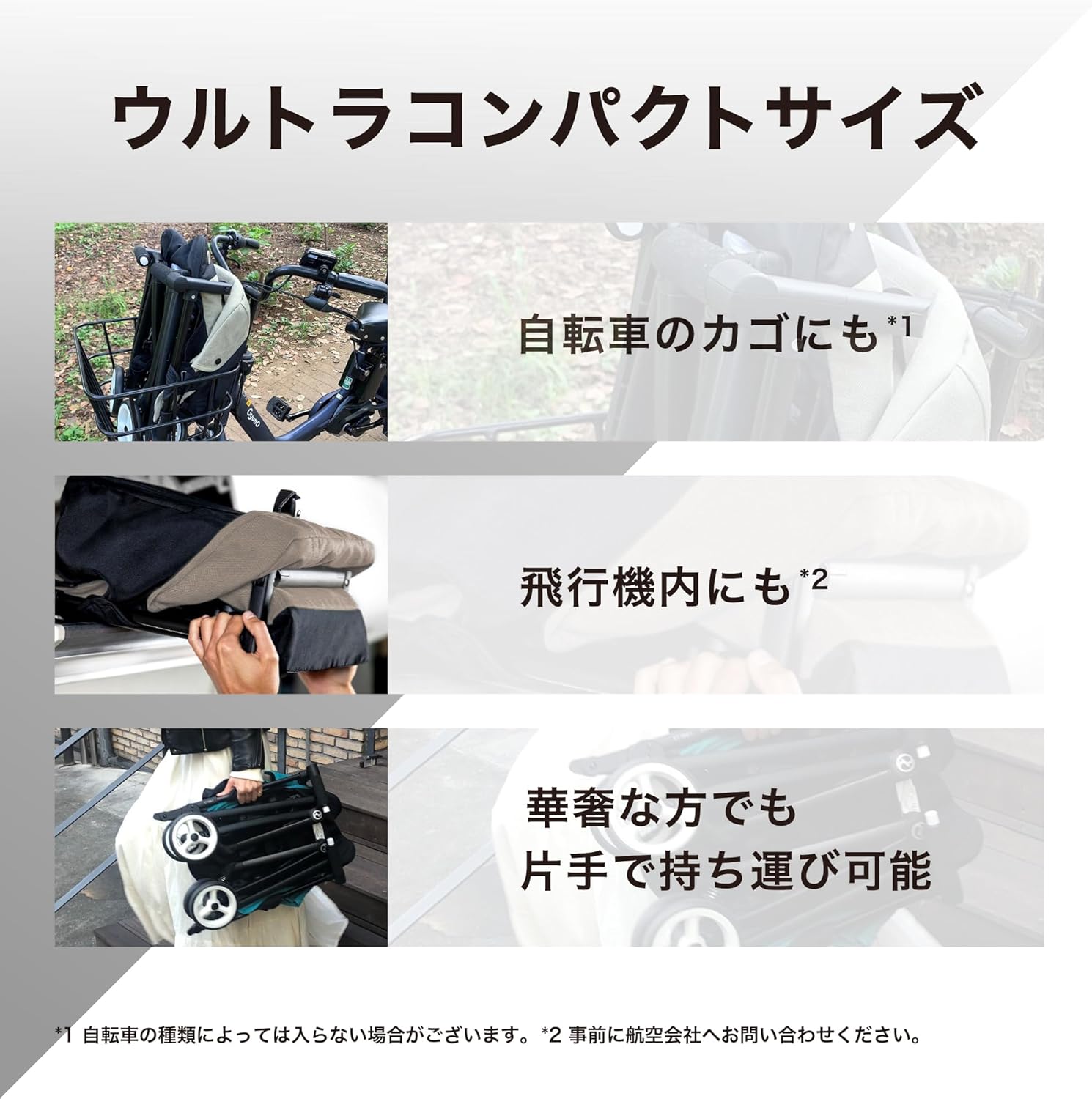 折りたたむと高さ48cm×幅32cm×奥行20cmという驚きのサイズになり、多くの自転車のの前カゴにすっぽり収まります。飛行機の座席上の棚にも収納可能なサイズです。(※航空会社によります)