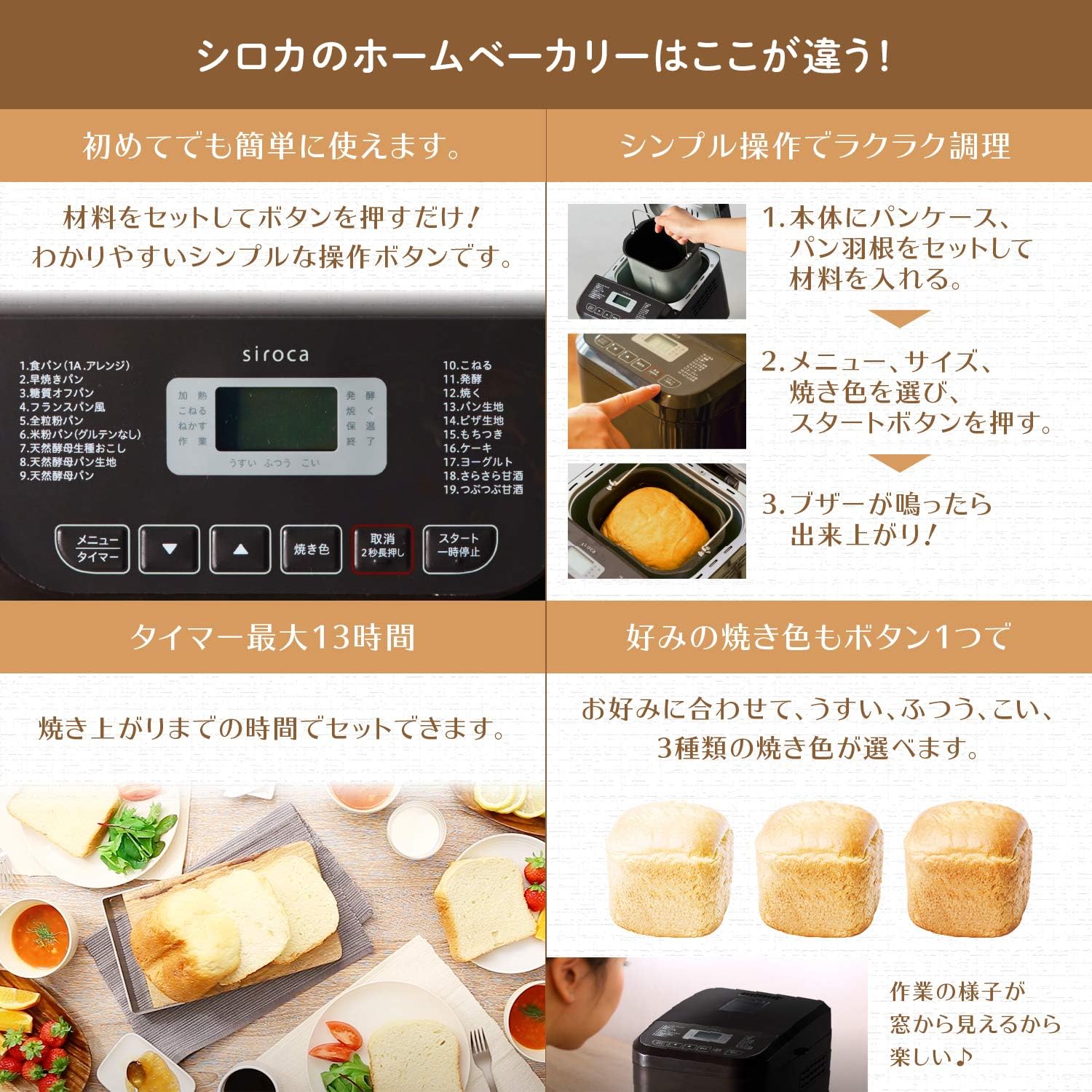 焼き上がり時間を最大13時間まで予約できるため、朝食に焼きたてのパンを楽しむことができます。お好みに合わせて3段階から焼き色が選べるなど、一台でパンのバリエーションを広げることができます。