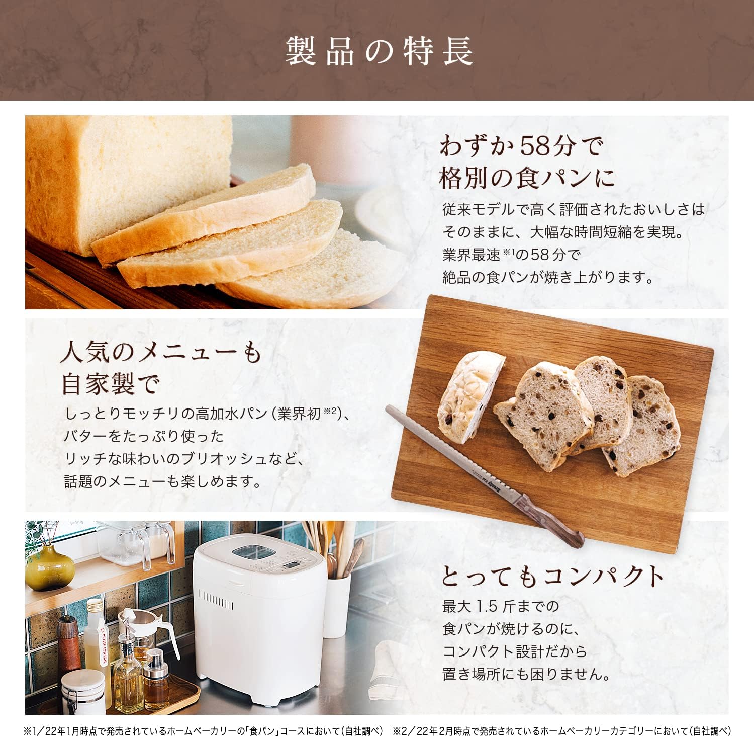わずか58分という短時間でパンを焼き上げるメニューを搭載し、家族で食べきりやすい1斤と1.5斤のサイズに対応しています。