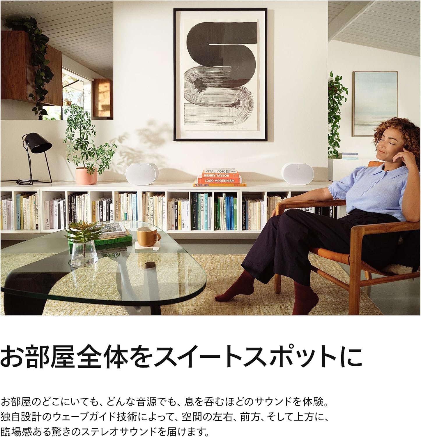 上向きのツイーターが天井の反射音を利用し、音を上下左右・前後に広げることで、まるで音楽の中にいるような没入感のあるサウンド体験を提供します。