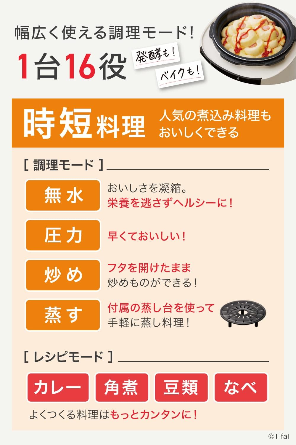 圧力調理はもちろん、幅広い調理法に対応しており、これ1台で毎日の献立作りをサポートします。
