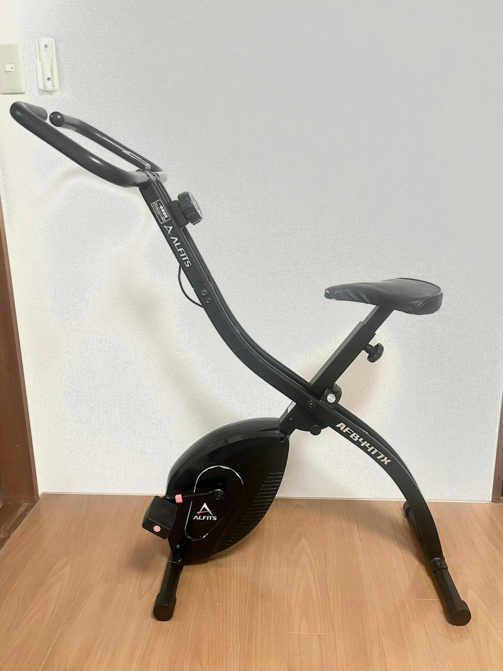 いちばん機能がシンプルなタイプにしましたが、エアロバイクを続けられるかどうか不安な人にぴったりだと思います。音はぜんぜん気にならないし、スペースもそんなに必要ないです。重さはけっこう重いので、色々なところに動かすというよりは乗る場所の近くに畳んで置いておく感じになります。