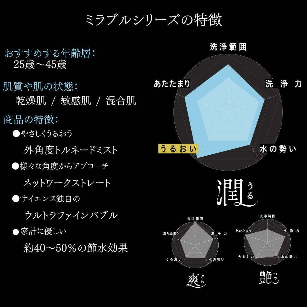外角度トルネードミストはふわっと広がるミストで、美顔器のようにしっとりした潤いを与えます。ネットワークストレートは網目状の水流で、肌の隅々まで洗浄し潤いを届けます。