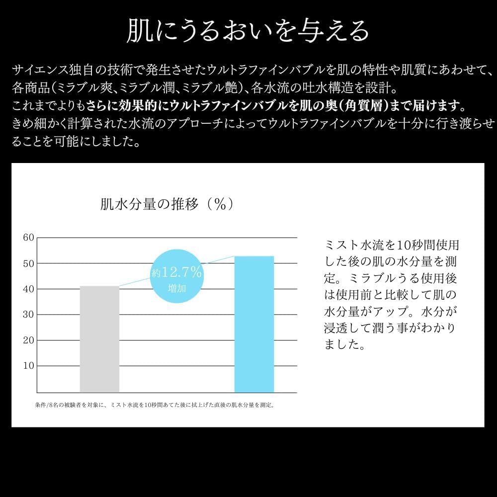 ミスト水流を10秒間使用した後の肌の水分量を測定したところ、使用前と比較して肌の水分量がアップすることが確認されています。