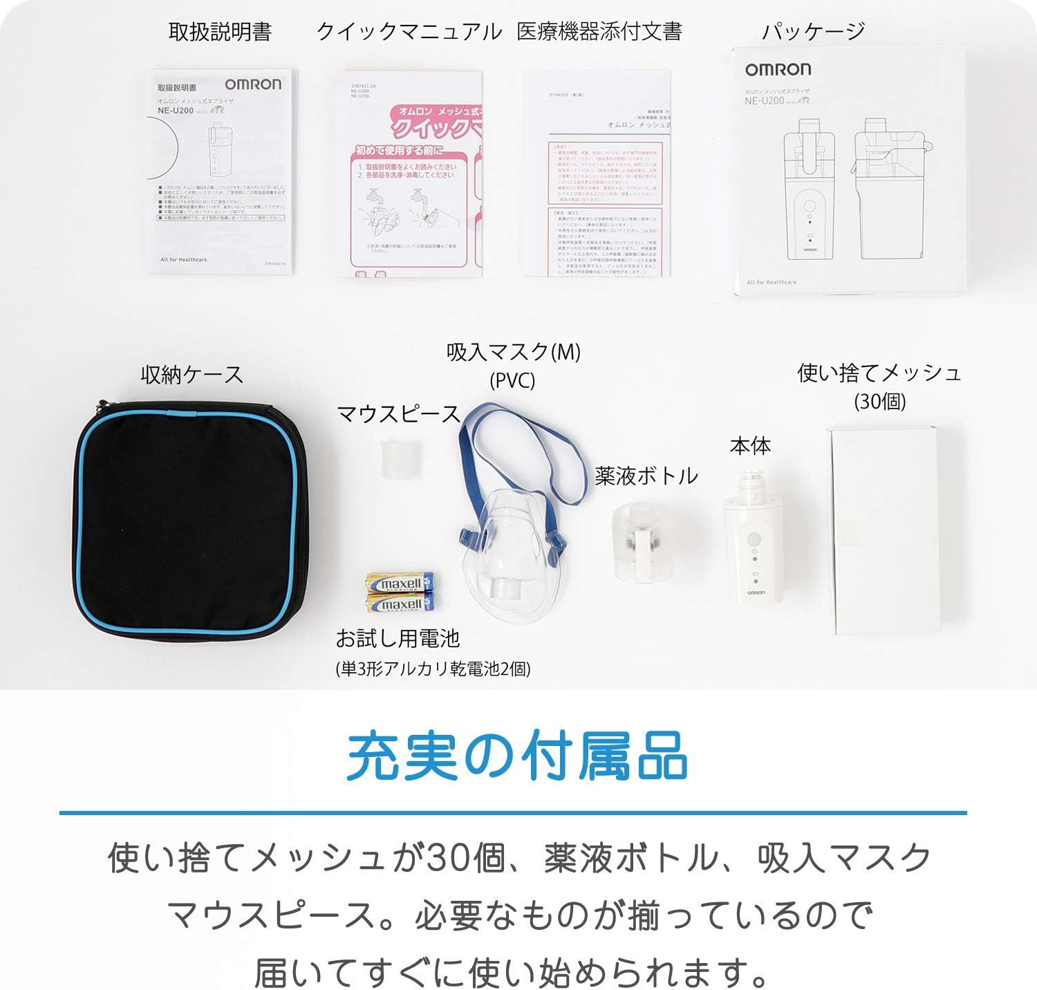 ・付属品:薬液ボトル、使い捨てメッシュ(30個)、マウスピース、吸入マスク(M)(PVC)、収納ケース、取扱説明書、クイックマニュアル、医療機器添付文書