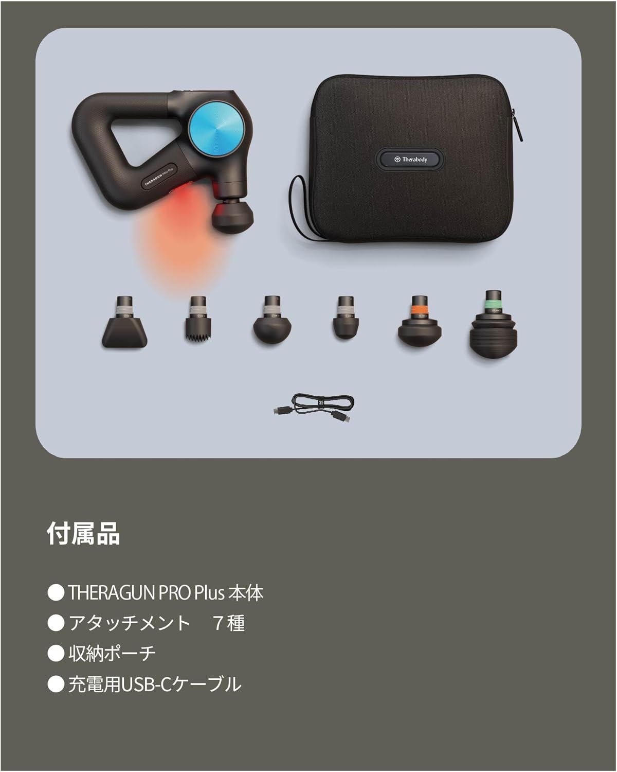 ・付属品:THERAGUN PRO Plus 製品本体、アタッチメント7種、USB-C充電用ケーブル、収納用トラベルポーチ