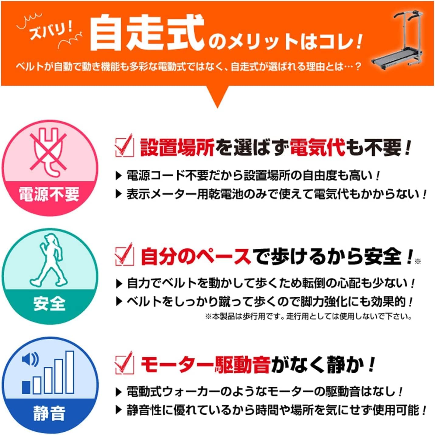 電動ではなく自力でベルトを動かして歩くタイプなので、自分のペースで運動することができます。モーターがないため、電源コードが不要で設置場所を選ばず、静音性に優れています。