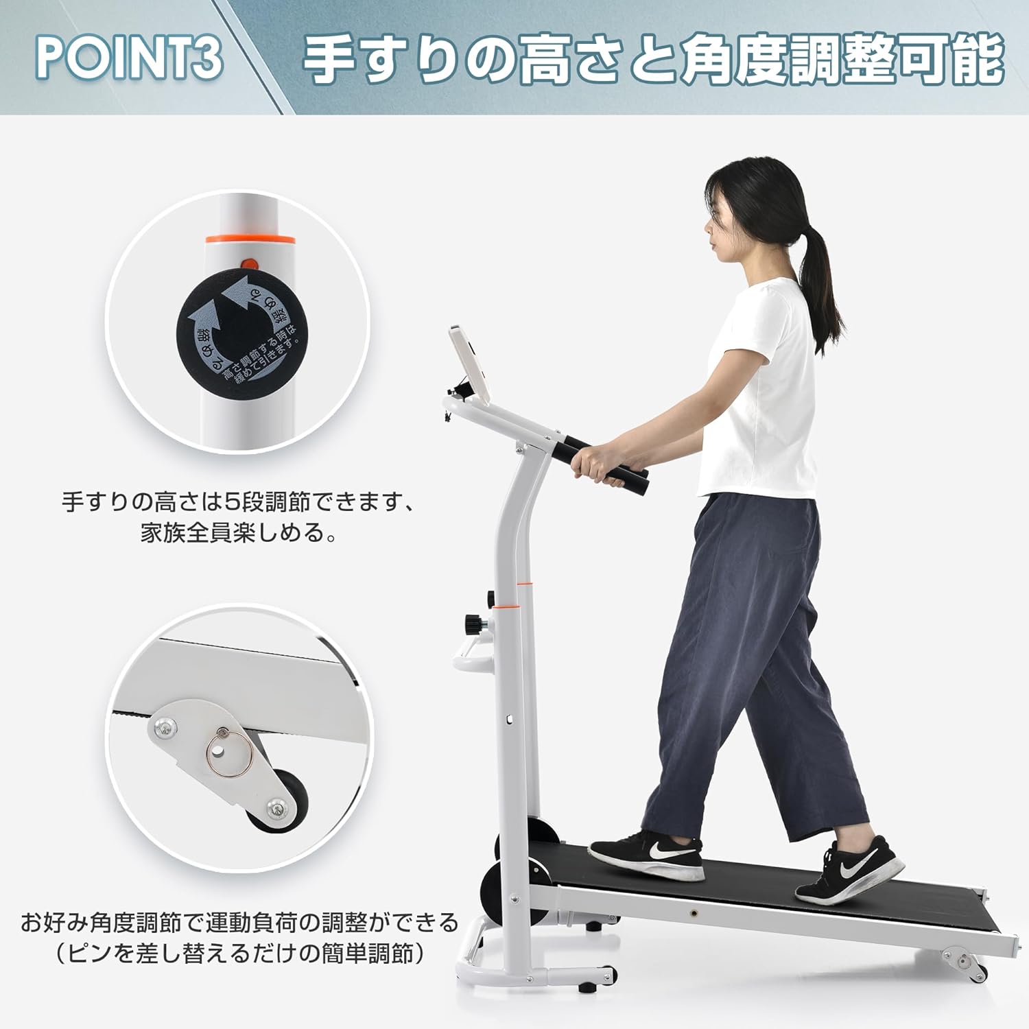一台でウォーキング、腹筋、腕筋、腰筋まで鍛えることができます。電源不要の自走式で、自分のペースで速度を調整でき、転倒リスクが少なくリハビリや初心者にも安全です。天候に左右されず、コストも抑えて継続しやすいのが魅力です。