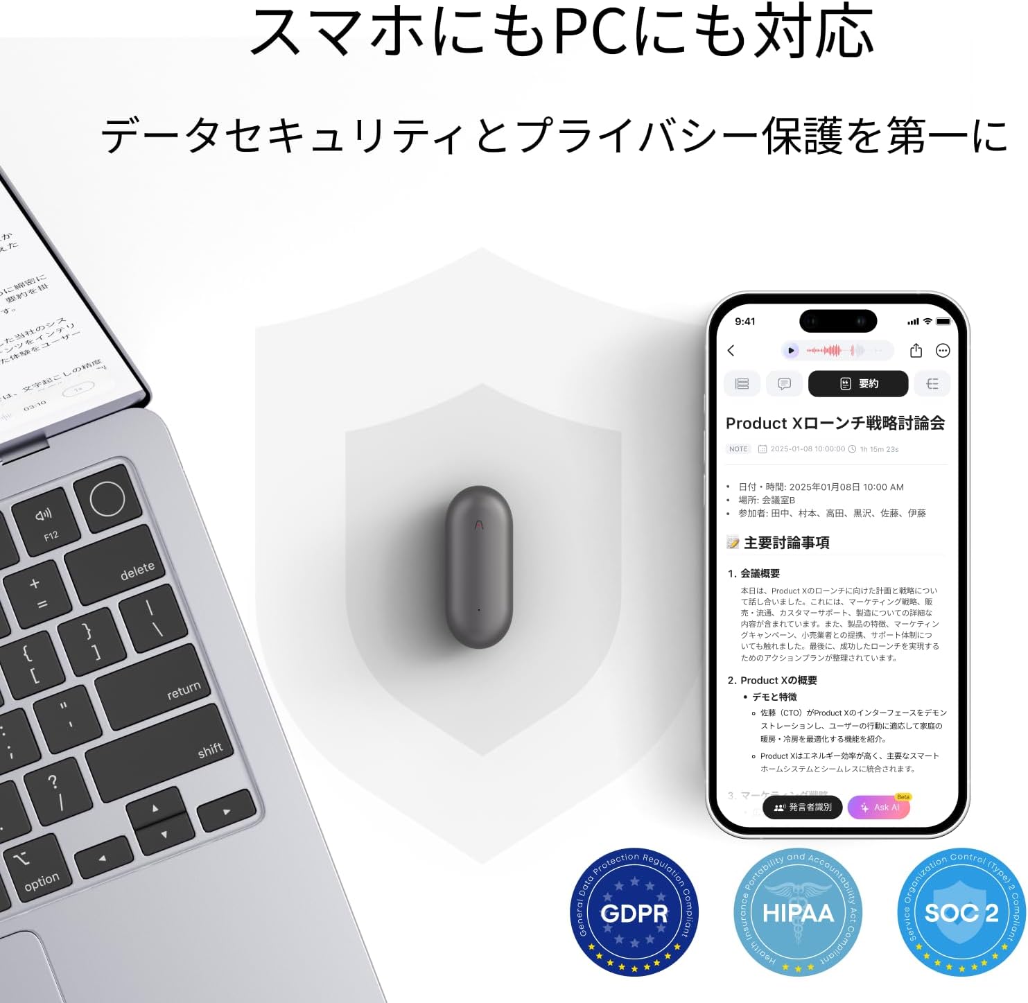 録音データを専用アプリを通じて自動で文字に起こし、さらにAIが要点を抽出・整理し、自動で要約してくれます。目立たないデザインなので、会議中や取材中でも自然に録音できます。